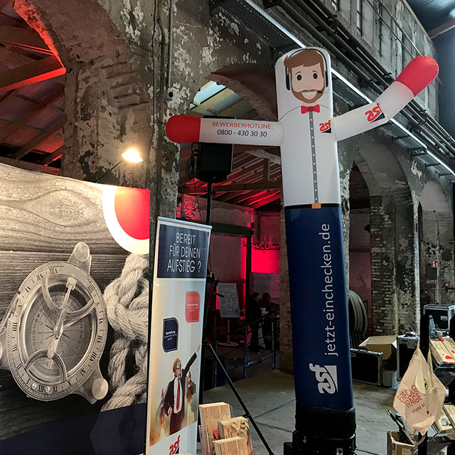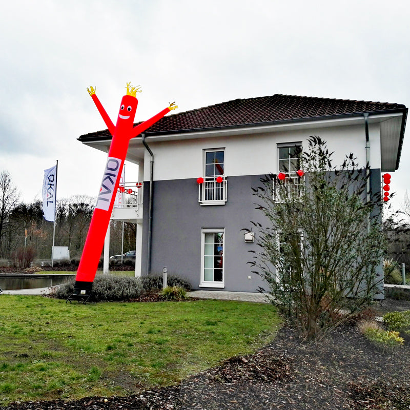 Wir haben einen neuen Lufttänzer für die Firma Okal gemacht. Diese 4m Luftpuppe, lächelnd freundlich den ganzen Tag, auch das Wetter war regnerisch.